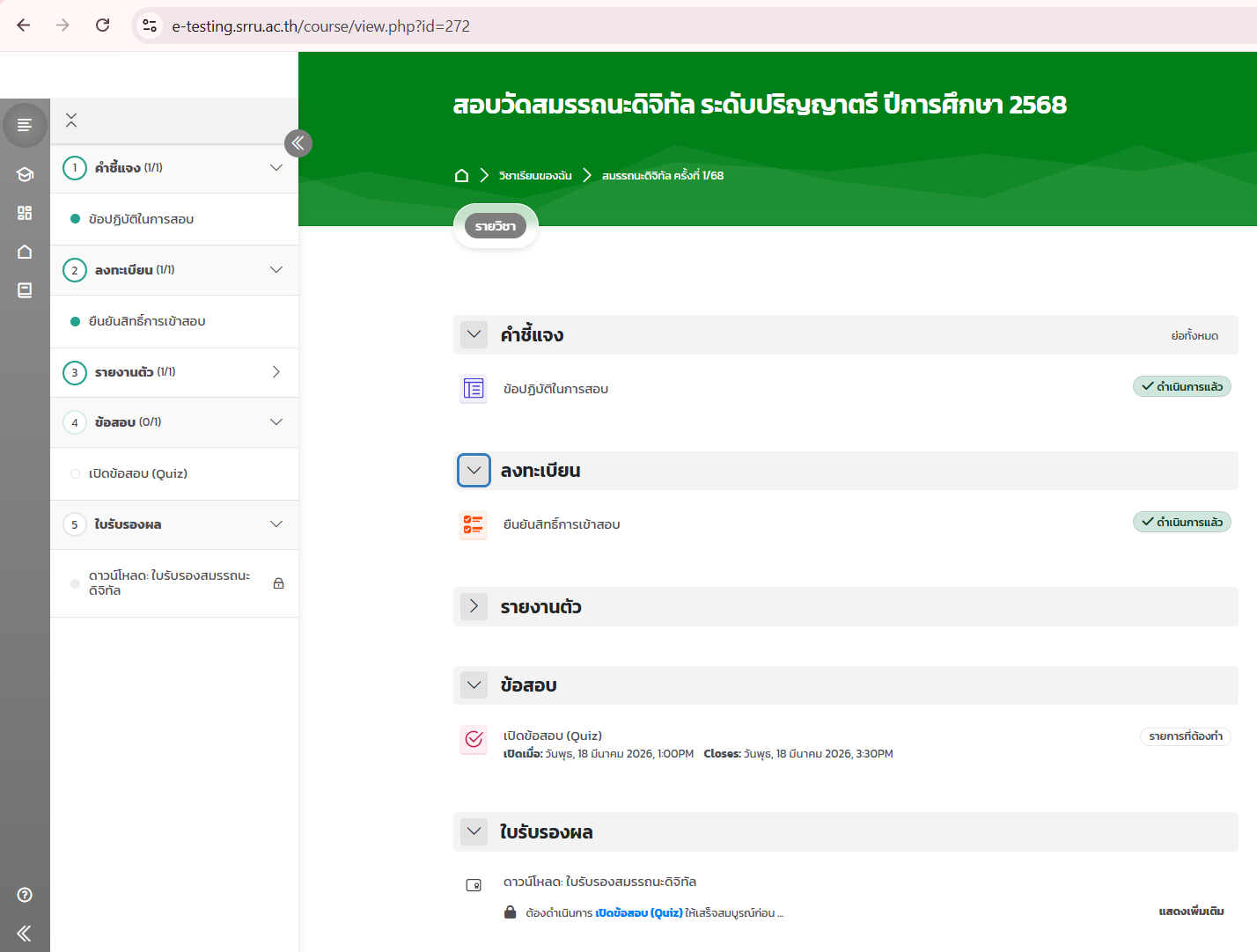 แบบทดสอบปรนัยแบบ 5 ตัวเลือก (A B C D E) จำนวน 30 ข้อ จับเวลา 45 นาที ทำได้เพียงครั้งเดียว ทั้งหมดมี 6 ด้าน