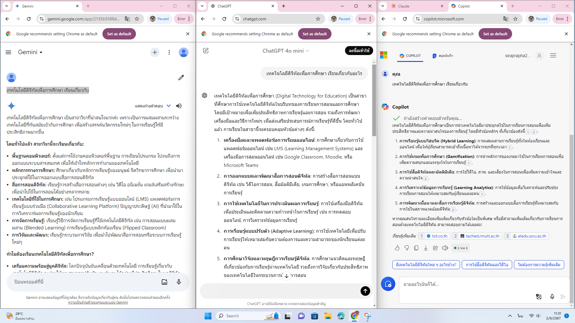 สิริรัตน์ จันทร์ปรุง 67121490107 โดย สิริรัตน์ จันทร์ปรุง - วันจันทร์, 2 กันยายน 2024, 11:50AM Number of replies: 0 chat GPT ใช้งานง่าย เข้าใจง่าย ผลค้นหาแม่นยำ Google Gemini แสดงผลค้นหากว้างไป Copilot ใช้งานง่าย แสดงผลข้อมูลที่ชัดเจน Permalink ตอบ